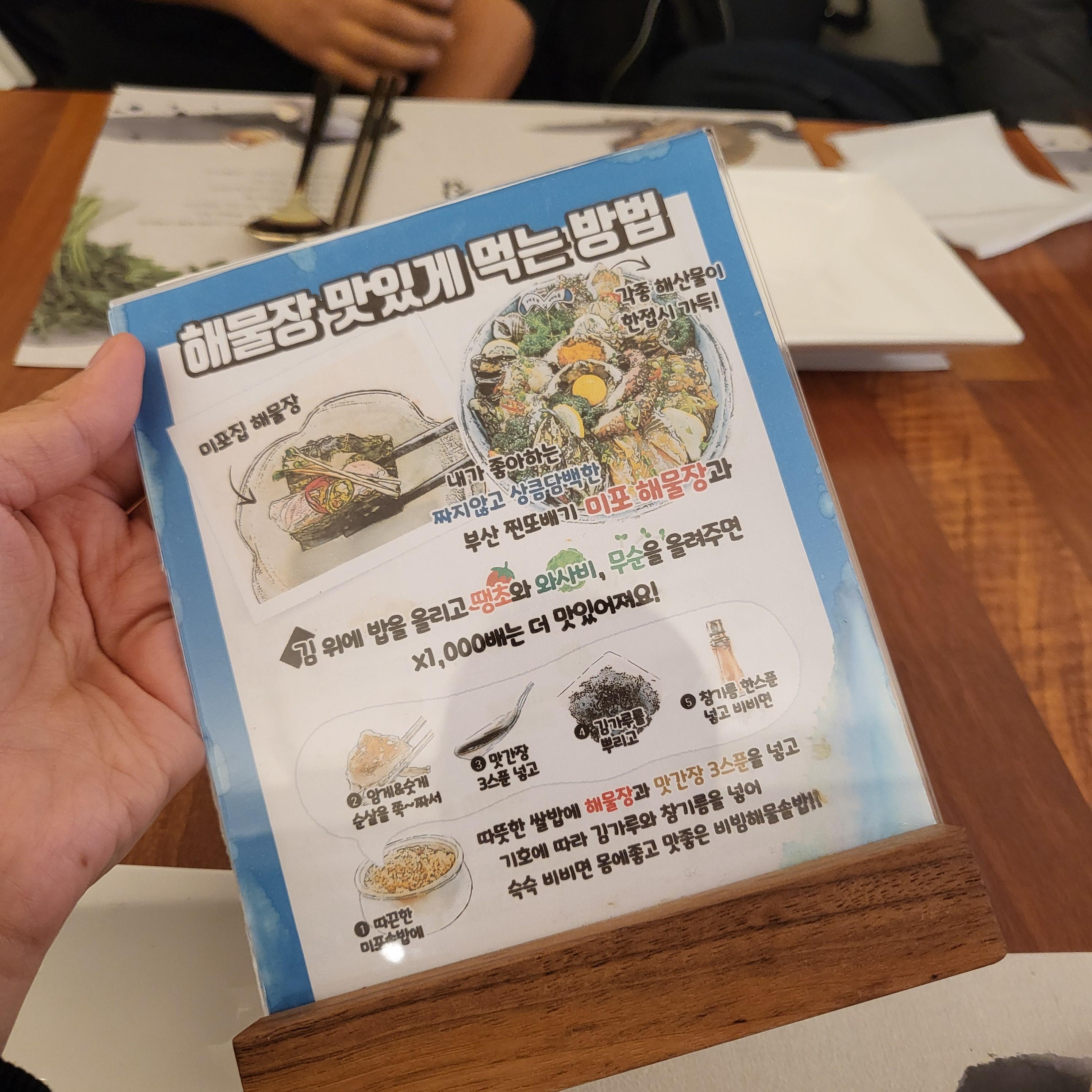 테이블 위에는 해물장 맛있게 먹는 방법이 놓여있었다.