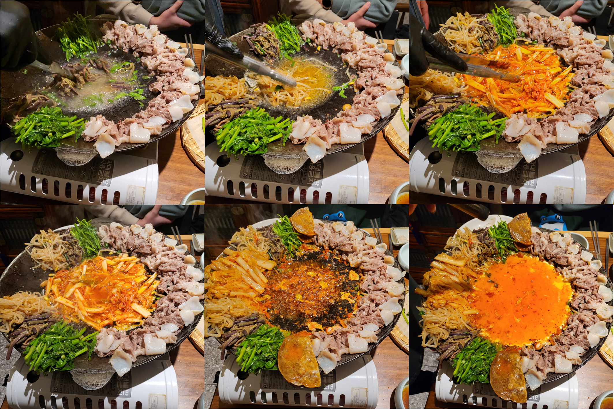우선 차돌박이와 미나리만을 구워서 솥 중간에 소기름을 모은 후 이 것으로 모든 재료를 차례로 튀겨주셨다. :)