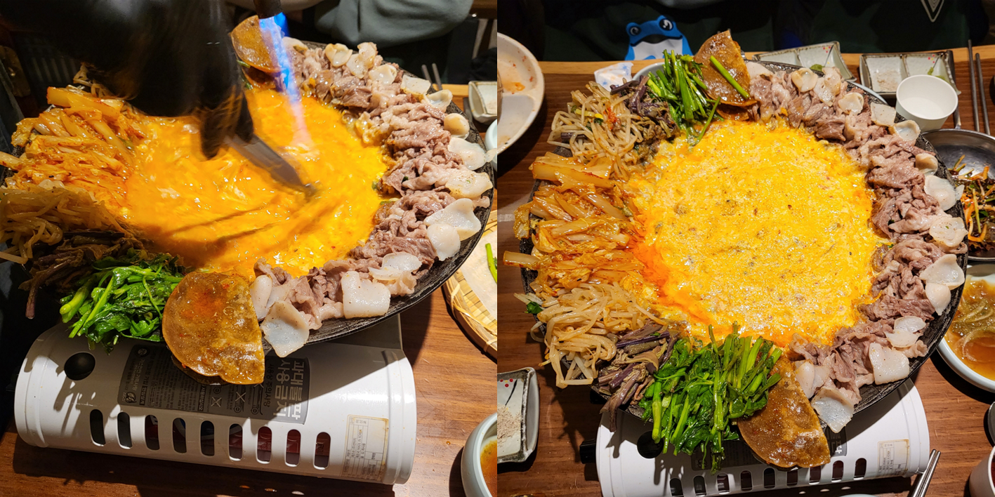 토치를 이용하여 계란찜을 익도록 계속 저어가며 만들었다. 완성된 차돌구절판은 정말로 먹음직 스러웠다.