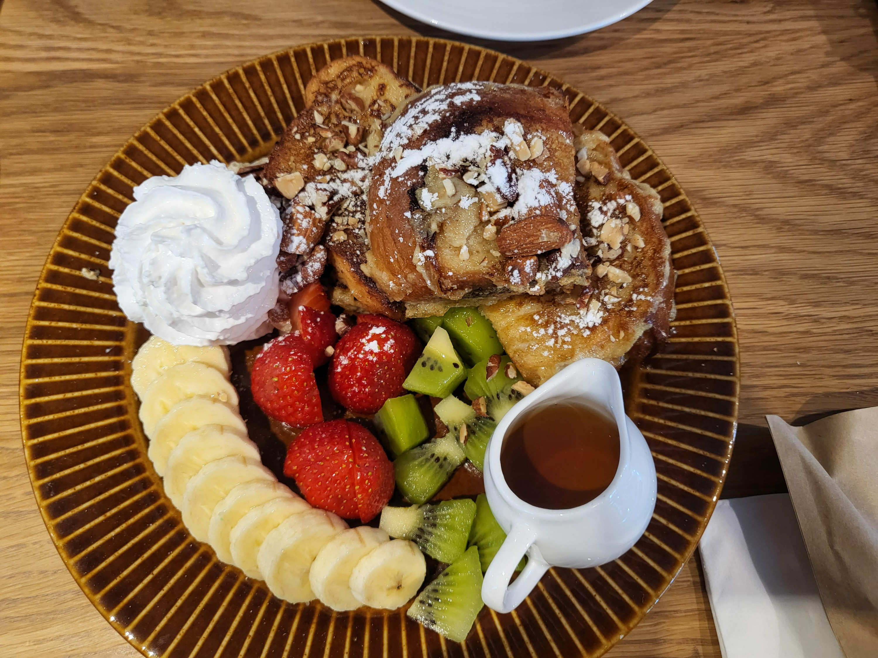 이번에도 오키가 가장 좋아하는 생크림 프렌치 토스트를 주문하였다. 이번 과일은 무화과, 키위, 바나나로 구성되어있었다.
