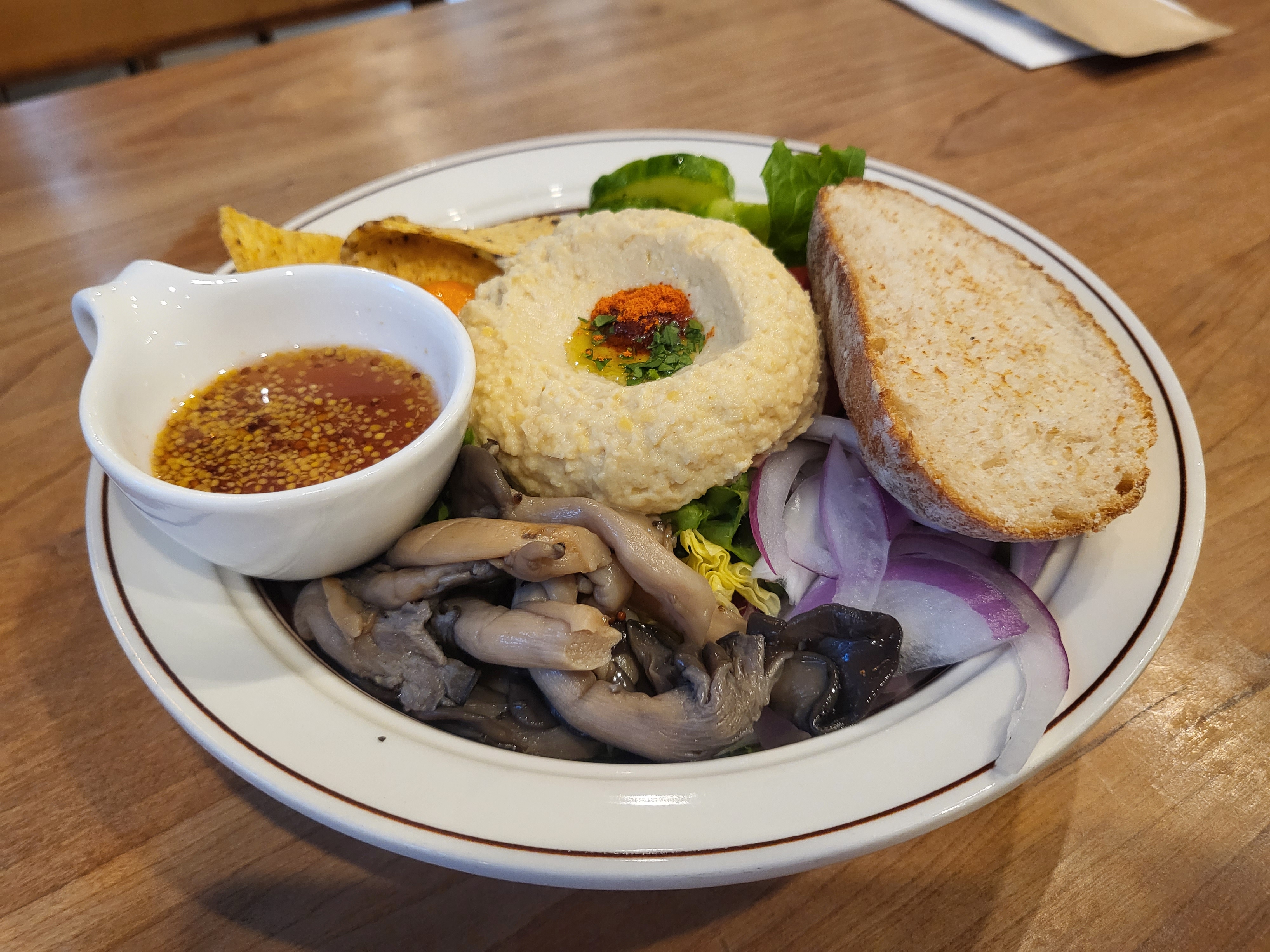 먼저 후무스 샐러드가 나왔다. 후무스는 찾아보니 병아리콩을 삶아서 갈아서 만든 중동지역의 음식이라고 한다. 샐러드는 오이, 버섯, 양파, 나초등등으로 구성되어 있었고 위에는 레드와인 드레싱과 빵이 놓여져 있었다.