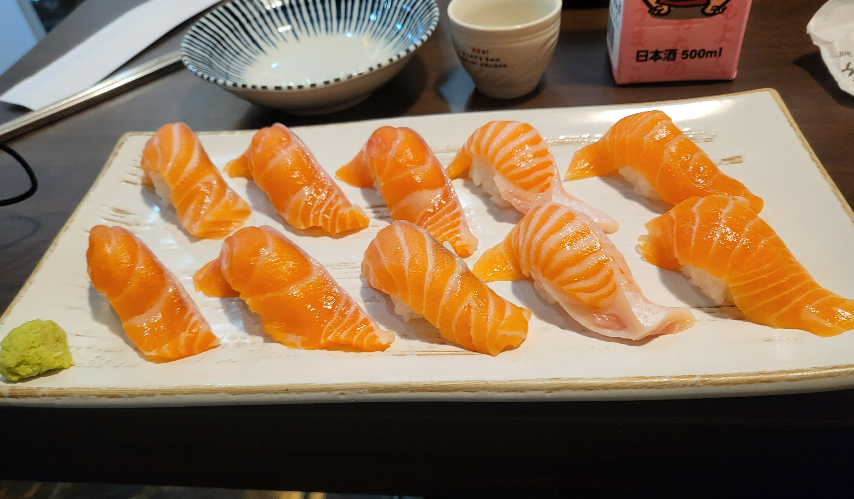 우리는 모듬초밥 + 성게알 하나를 주문하였고 연어를 매우 좋아하는 오키는 연어초밥세트를 주문하였다.