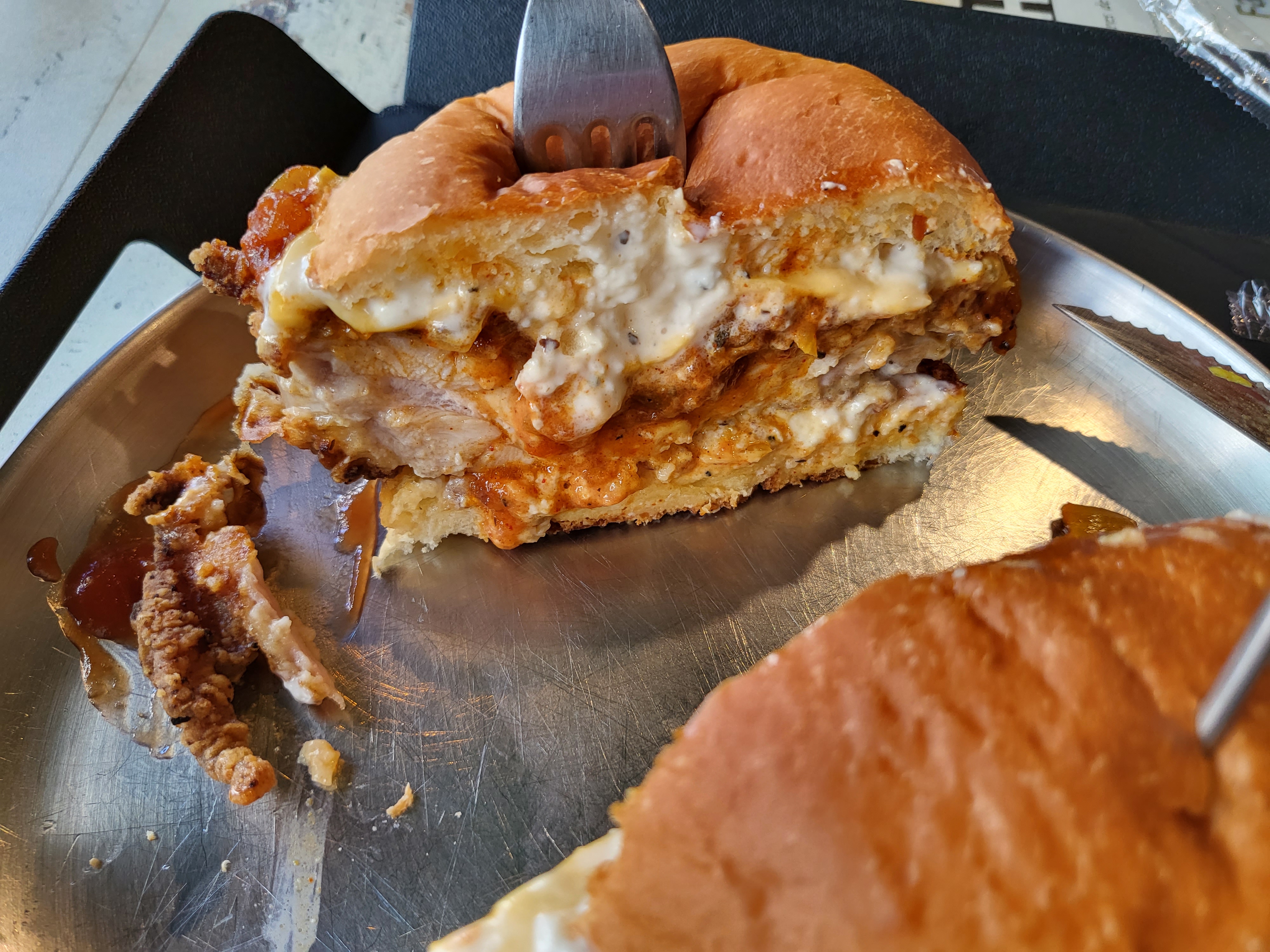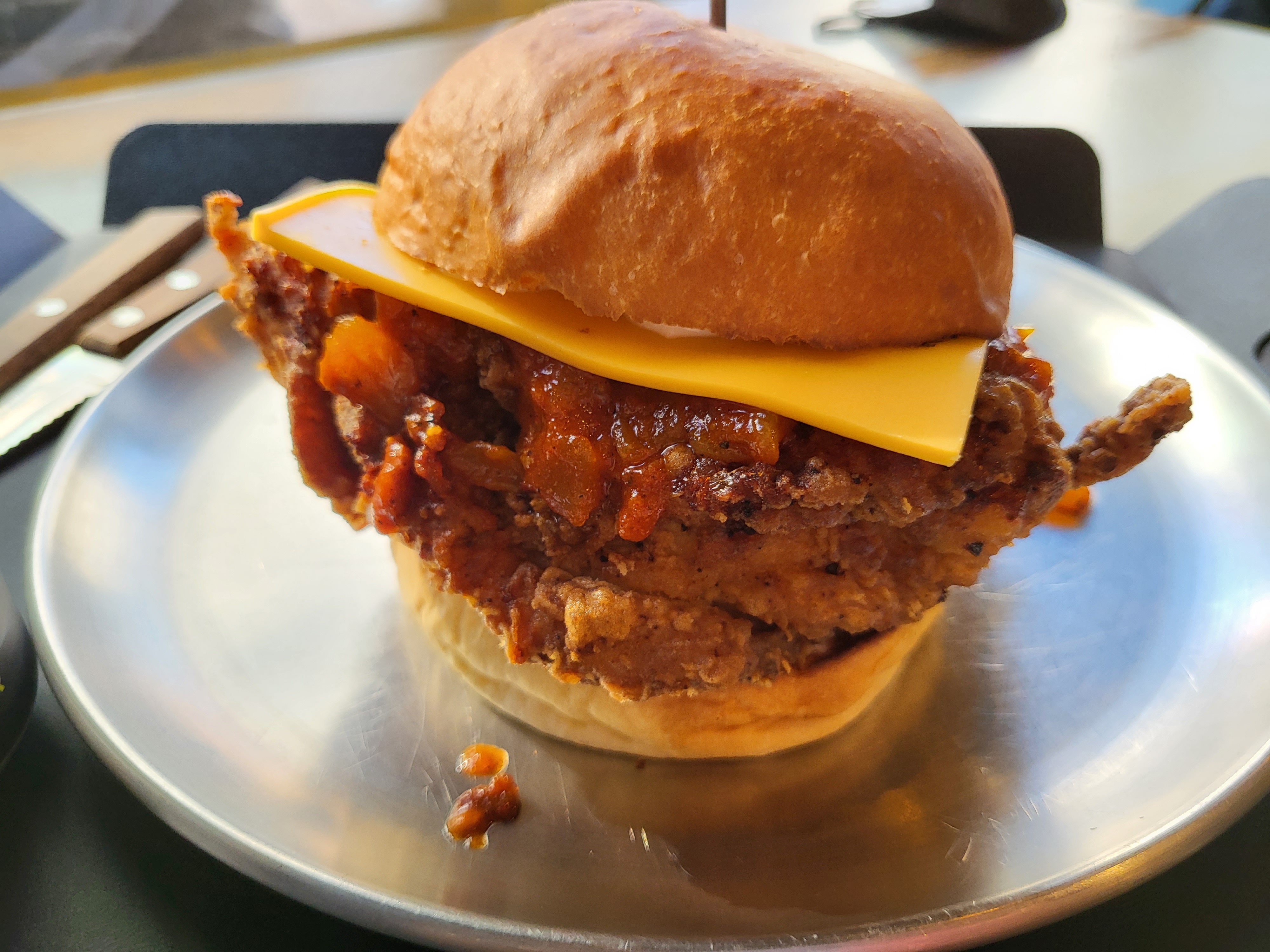 치킨패티와 소스의 뜨거운 기운에 체다 치즈가 점점 녹아가고 있었고