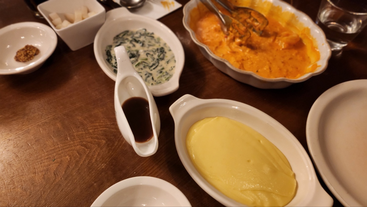 사이드로 으깬 감자, 크림 시금치를 시켰다.