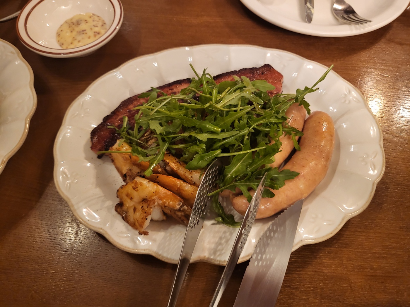 플래터는 통베이컨과 새우, 구운 소세지가 제공이 됐는데