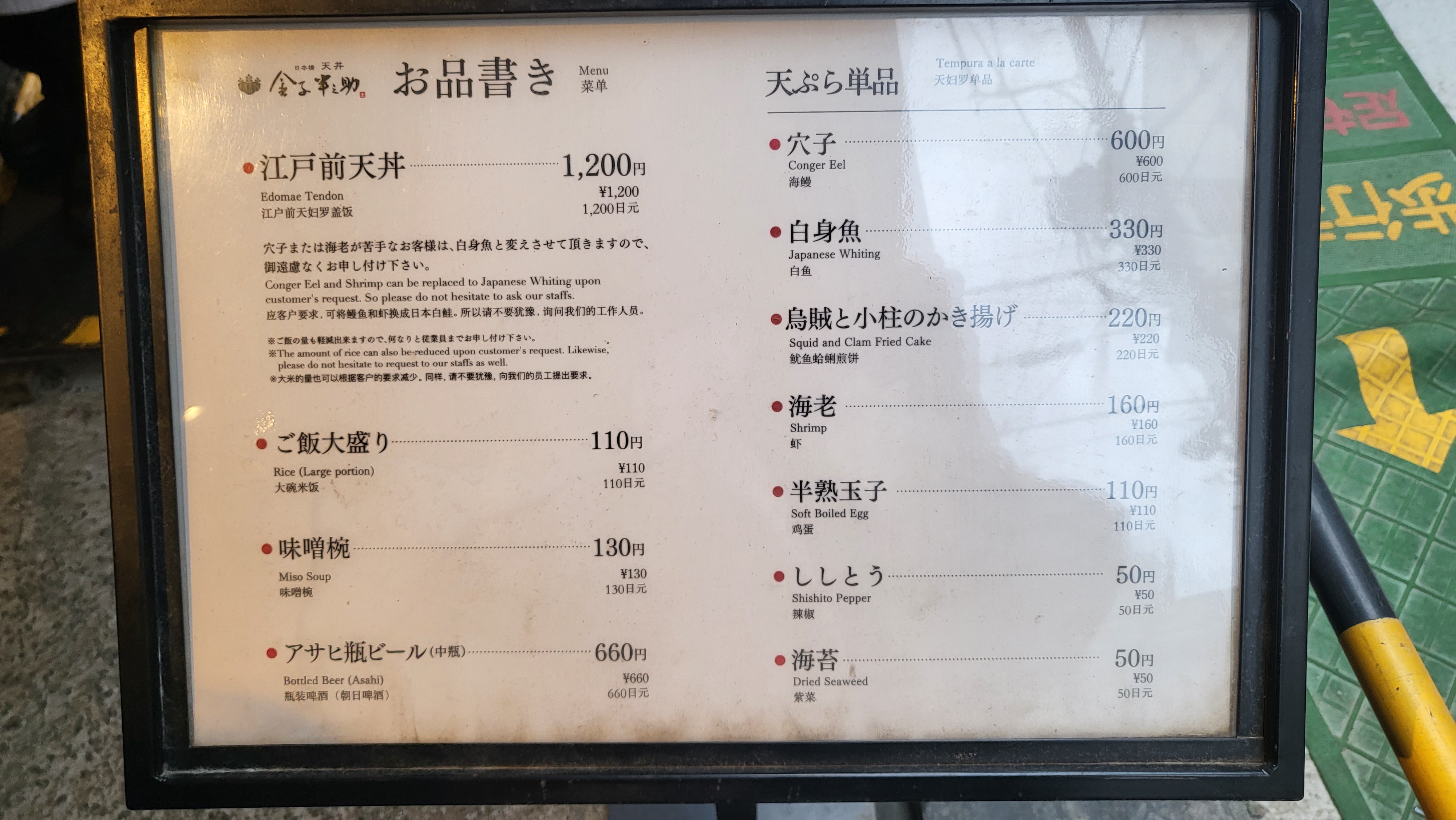 메뉴는 1200엔 텐동하나였다. 추가로 튀김을 추가할 수 있었지만, 우리는 텐동 1개씩 주문하였다.