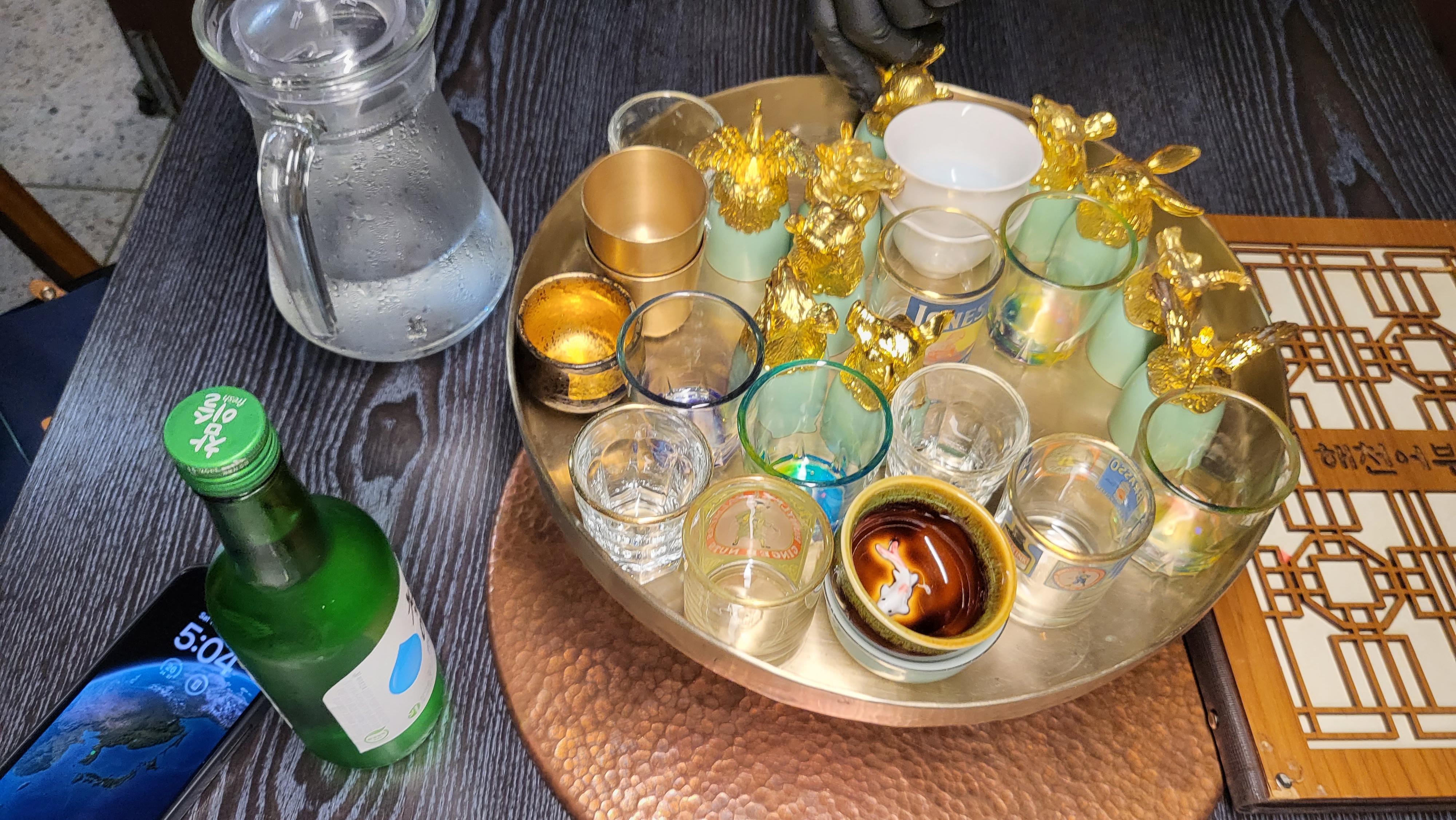 먼저 음식이 나오기전에 소주와 함께 술잔을 선택할 수 있도록 여러가지 술잔을 가지고 오셨다.