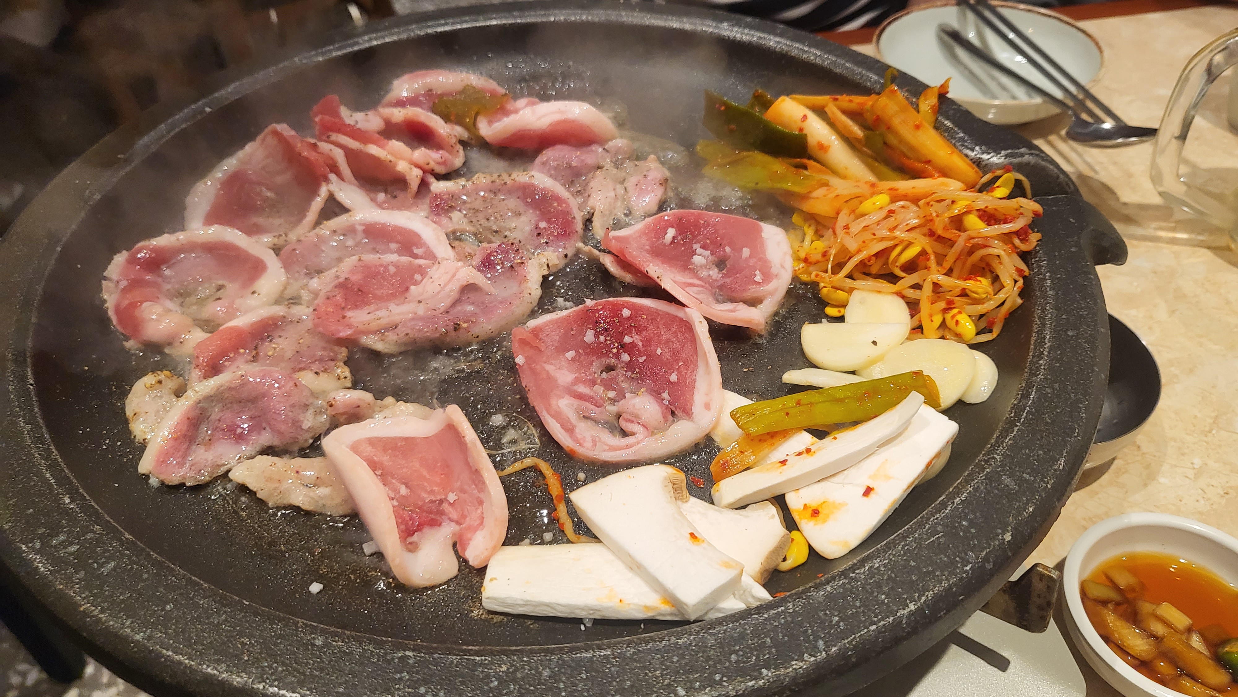 버섯, 콩나물무침, 대파무침, 마늘을 한켠에 올려놓고 오리고기를 불판에 올렸다.