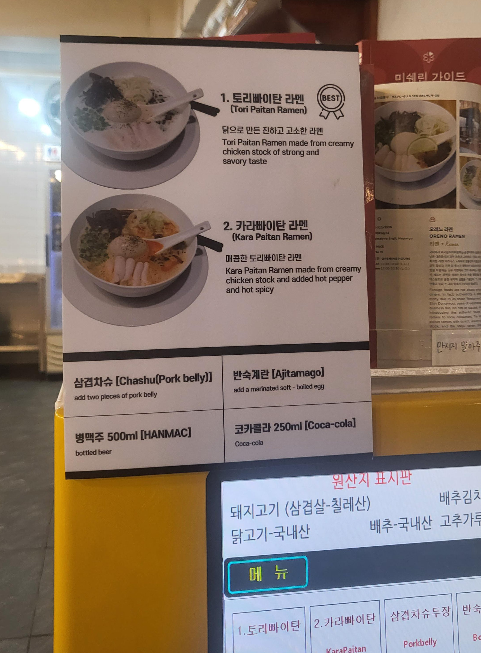 메뉴는 토리빠이탄라멘과 카라빠이탄 라멘 두가지가 있었다.