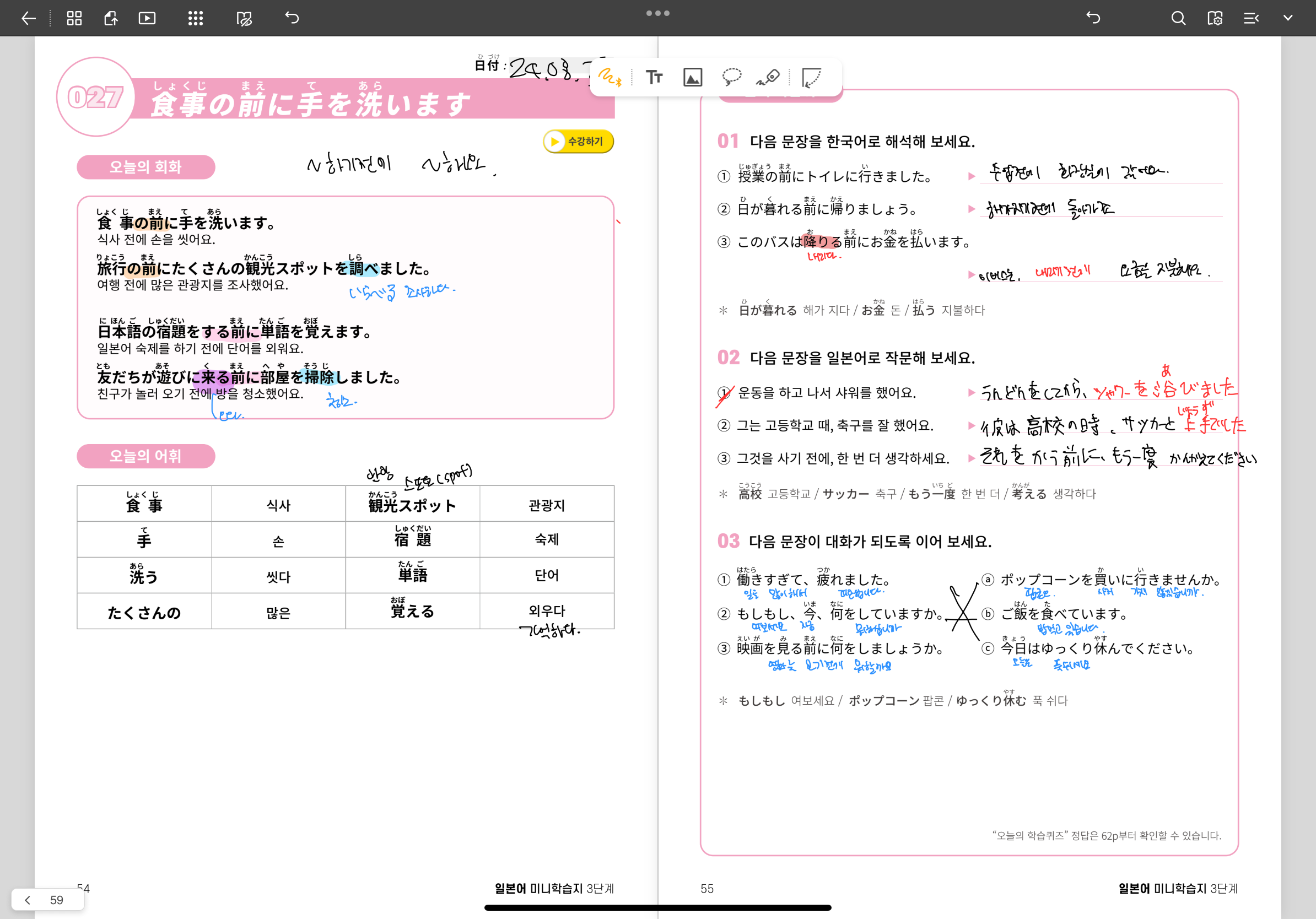 그리고 문장이 대화가 되도록 이어지는 질문이라던가 문장속 맞는 단어를 고를 때 단순 일본어가 쓰여있던 부분을, 정답지엔 없지만 직접 해석하여 적어보기도 하였습니다