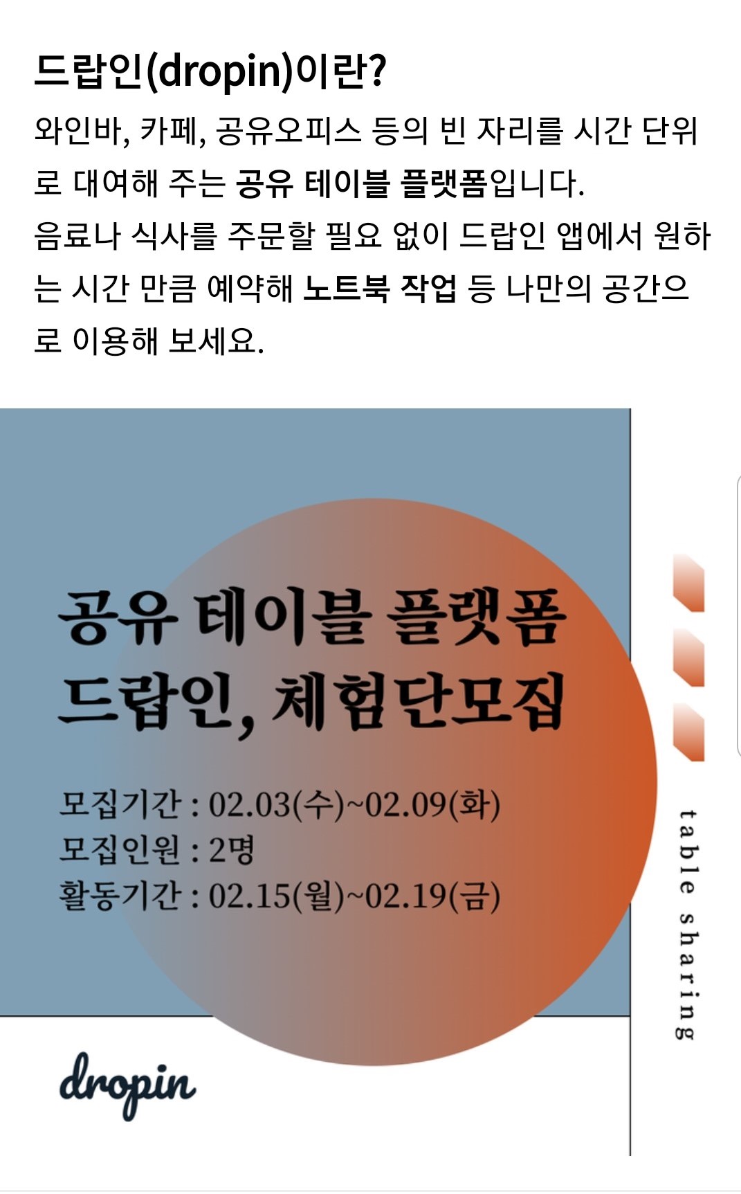공유 테이블 플랫폼 드랍인, 체험단 모집. 이라는 글이였다.