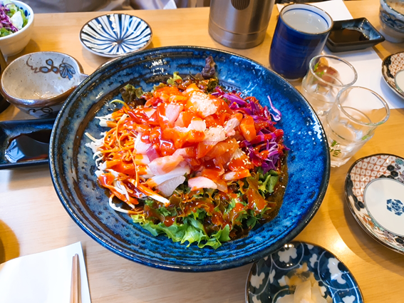 먼저 회무침이 먼저 나왔다. 회무침 안에는 연어 참치 등등 여러가지 회와 야채들이 많았다.