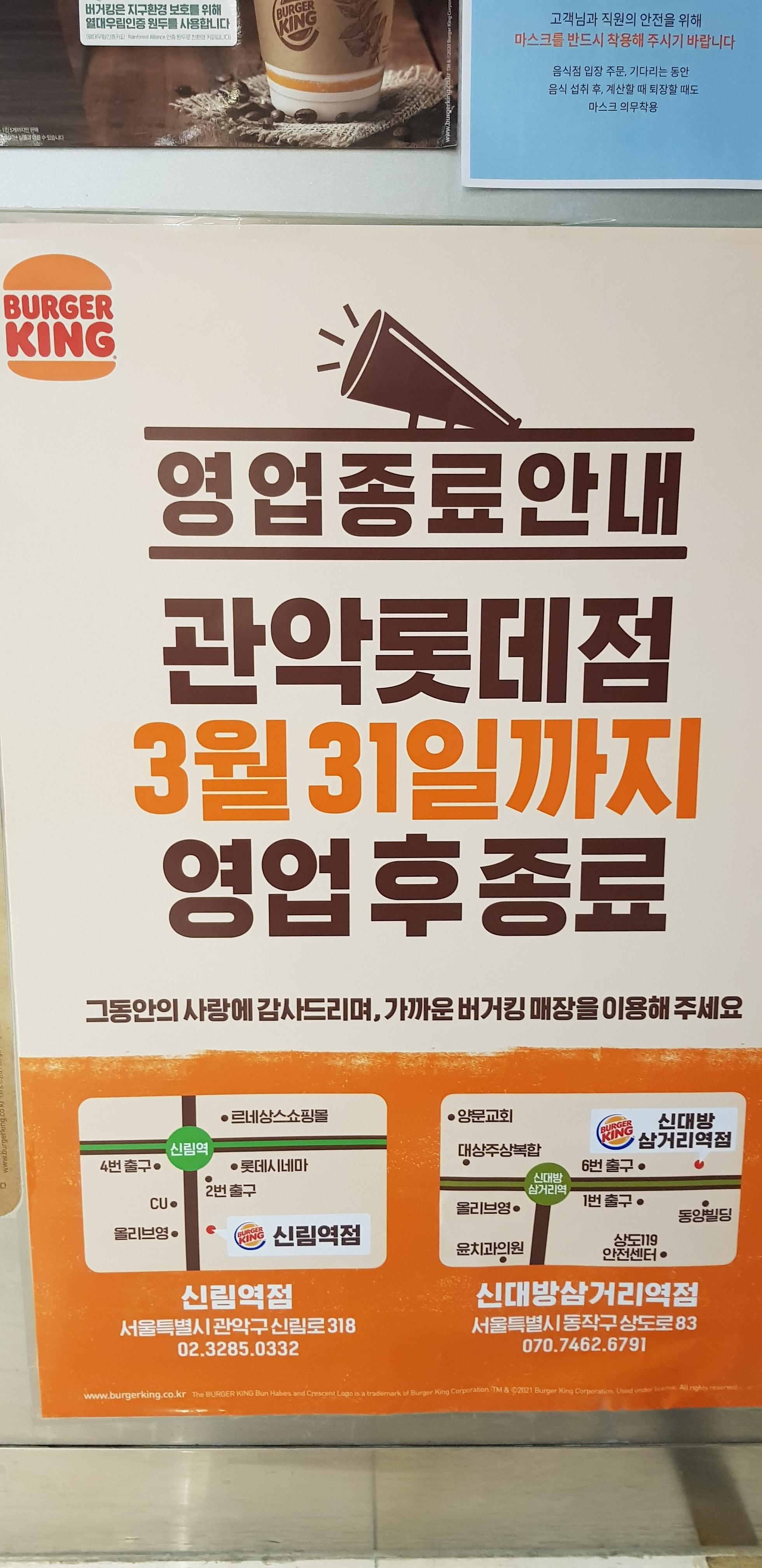 항상 가던 관악 롯데백화점 지하 2층에 있던 버거킹이 3월 31일 영업종료한다는 소식.