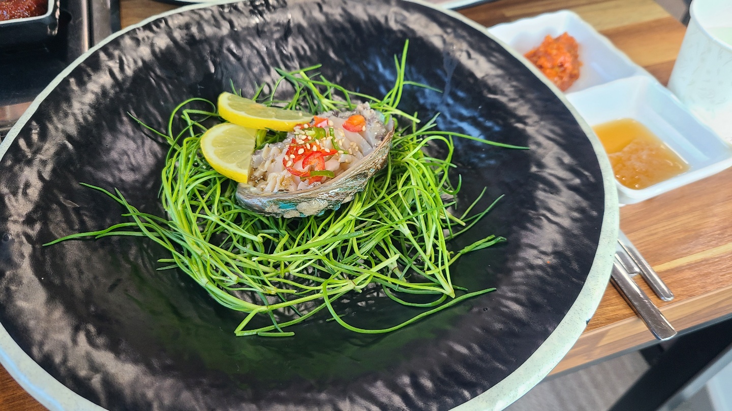 여기는 간판이름과 함께 주메뉴는 전복과 함께 곁들여 먹을 수 있는 요리 !